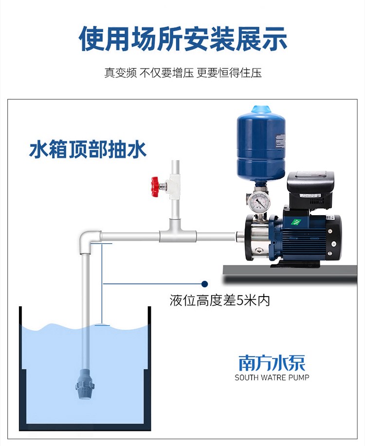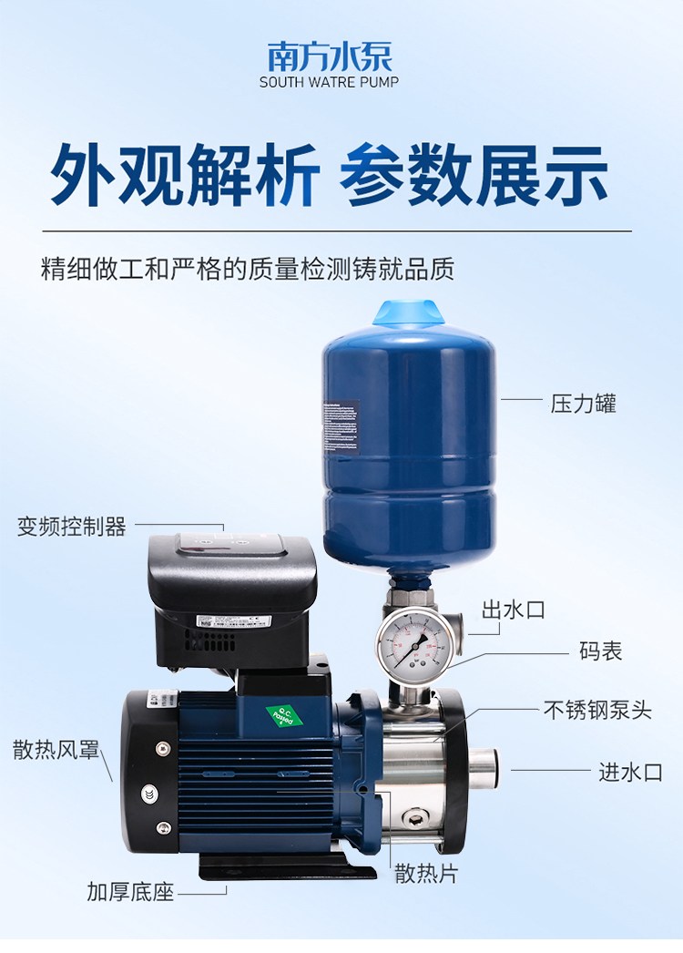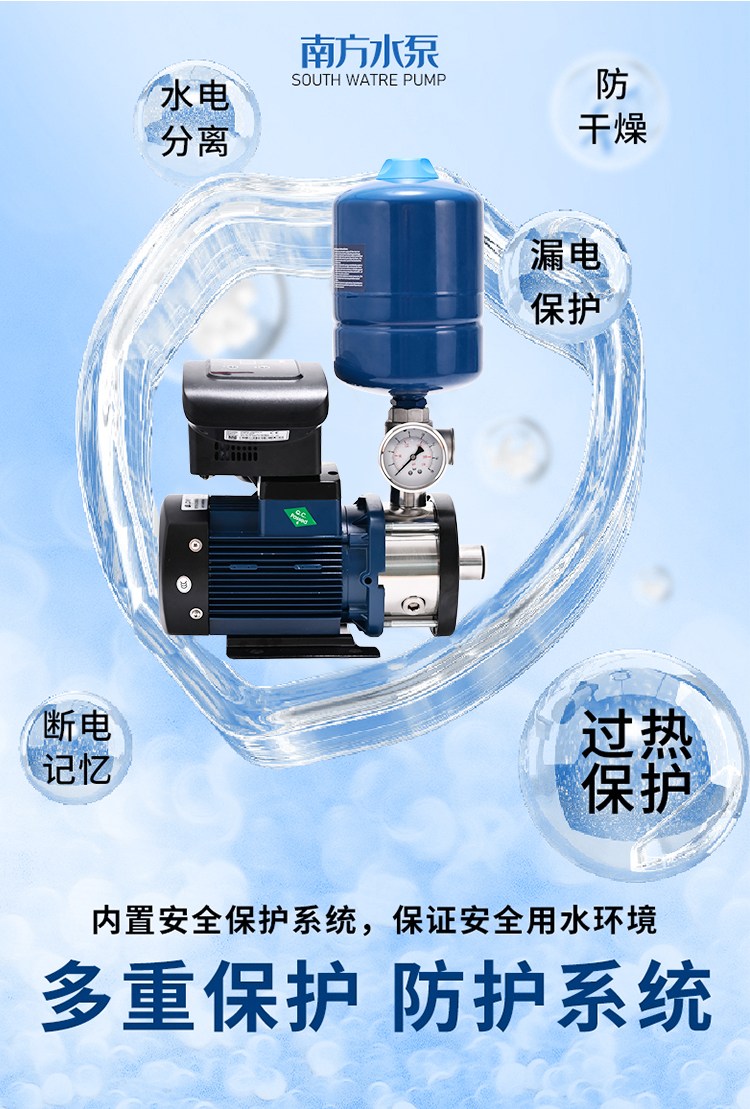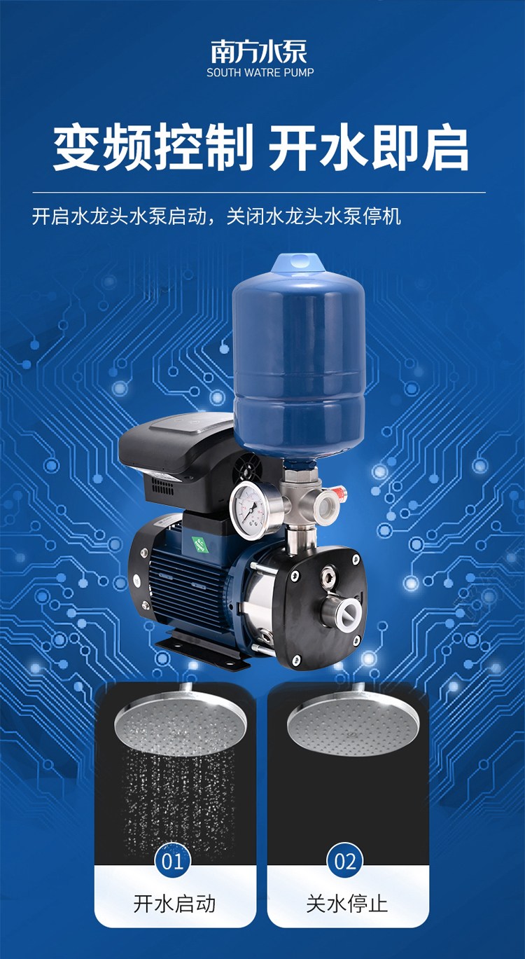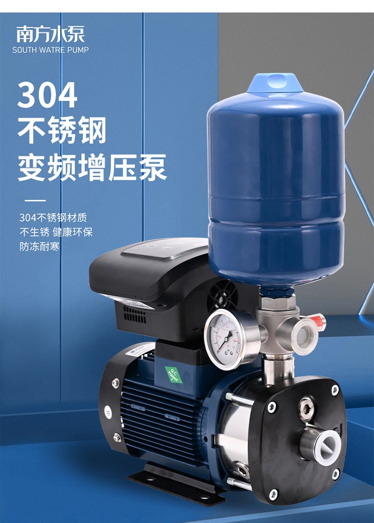 南方CHME系列臥式智能恒壓變頻泵采用了變頻調(diào)速及自動化控制相結(jié)合的技術,配合高效節(jié)能的CHM非自吸輕型臥式多級離心泵。整機主要由CHM泵、控制器、傳感器、壓力罐、五通止回閥及軸向抗震壓力表等組成。具有性能穩(wěn)定、高效節(jié)能、全自動智能控制、低噪音、耐腐蝕、結(jié)構(gòu)緊湊、外形美觀、體積小、重量輕等特點。